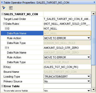 Over on the table operator properties panel, I turned on the two data rules and set them to move all errors to the error logging table.