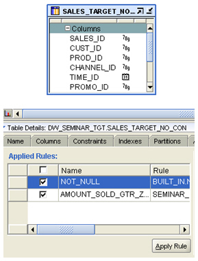 For the mapping that used a data rule to handle errors, I first created a couple of manual data rules, one for AMOUNT_SOLD > 0 and one for PROMO_ID is NOT NULL. I then added this to the target table using the Data Object Editor, like this:
