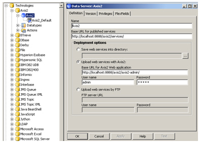 The second bit of ODI web service functionality is Data Services. Data Services allow you to take a data store in your ODI repository (usually a table or view, but it can also refer to anything that ODI recognizes as providing data) and give it a web service interface, so that outside applications can select from it, update it, delete from it and so on. ODI comes pre-configured to work with Apache Axis2, a web services engine that you can download free from the Apache website and installs pretty easily into the OC4J container in Oracle Application Server. Once you've defined an Axis2 data server in your Topology Manager application, like this: