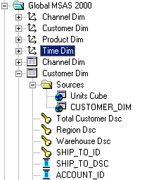 I then do the same for the CUSTOMER_DIM, PRODUCT_DIM and TIME_DIM tables, and of course for products and times I'm going to have new columns coming across from Oracle that don't exist in the model already, which represent the Month and Item levels that were aggregated out of the Analysis Service cube.