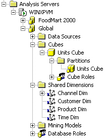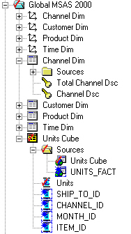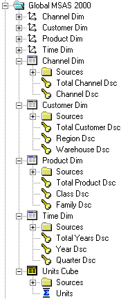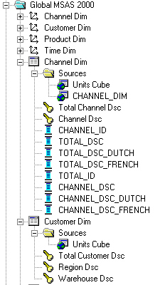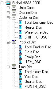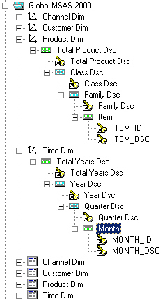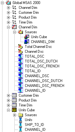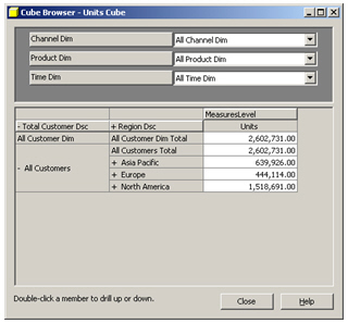 In this scenario, an Analysis Services 2000 cube has sales data dimensioned by product, customer, time and channel. The data comes in from the Oracle database at product item, customer ship to, sales channel and month level, and then gets aggregated up from the product family, customer warehouse, sales channel and quarter level, i.e. its dimensions do not go down to as detail a level as the source Oracle data.
