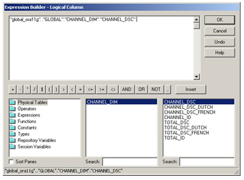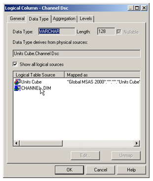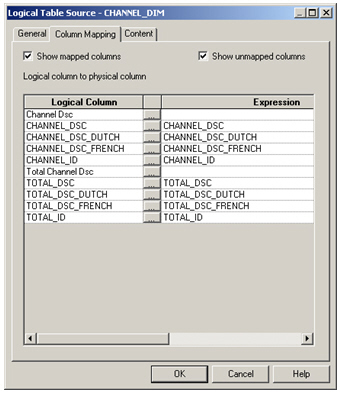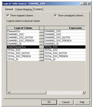 I then use the Column Mapping dialog to correctly map each logical column to its physical source. I do this by clicking on the ellipses (...) button next to the un-mapped columns and then use the expression builder to select the correct column in the physical table source.