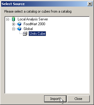 Once you've connected, Administrator shows a list of the available cubes, and I selected the Global cube I'd created earlier and pressed the Import button.