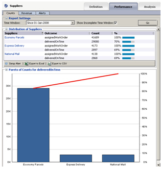 Taking a look at the distribution of orders, we can see that most have gone to Economy Parcels, who just happen to charge the least for delivering. As the load generator script has assigned a 70% chance of delivering on time to all suppliers, one delivering more reliably than another hasn't had a chance to impact the decision, but if, for example, Express Delivery turned out to deliver more reliably than all the others, it would end up getting selected more and more times.