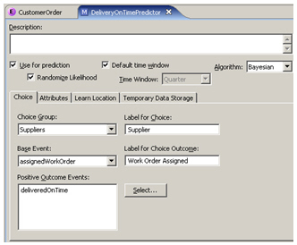 To do this, I go back to the application and define the new Choice Event Model This new type of model takes two events that I assign to suppliers, "Assigned Work Order" and "Delivered On Time", and records these bits of information for each delivery that takes place.