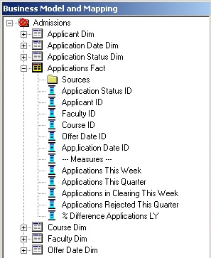 Now that I was confident the software was set up correctly, I took some time out to discuss with the client the area we'd be reporting on (for the purposes of the example, the student registry at a university), and tried to identify the main business processes that made up their part of the organization. OBIEE needs the logical (or business) data model it works on to be a dimensional star schema (fact tables surrounded by dimension tables), and so through doing this I was trying to establish the facts (which generally are based on business processes, like students applying, offers being made, students being admitted, grades being published, courses being attended and so on) and the dimensions (the "actors" and "products" in the business process, in this case students, courses, faculties, sites, periods and so on), with the dimensions then being used to analyze the fact tables. All of this is actually all basic dimensional modeling, it's not specific to OBIEE, and the deliverable out of this part of the work is a conceptual dimensional model that shows the flow of data from one end of the business process to the other.