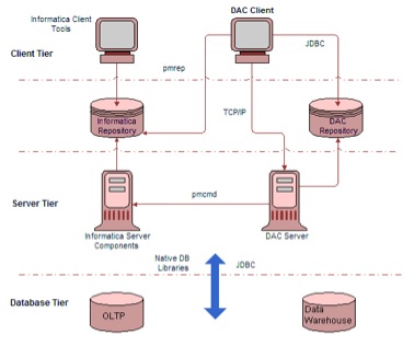 The next tier up contains the databases that hold your Informatica and DAC repositories. These can be stored in the same database (the same schema, even) and can be on their own physical server, or placed on the server that holds the OBAW or the source system databases. The final tier is the client tier that holds the administration tools used to define and then execute the Informatica mappings.