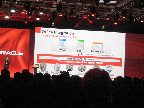 Matt Bedin's session on New Technologies in OBIEE didn't introduce anything absolutely new, as in only announced this week, but it did go over the new Essbase Studio application, the new sample application that comes with OBIEE 10.1.3.4, and the integration that's now possible between OBIEE and (Hyperion) EPM Workspace. This new Workspace integration looks good, and it was good to hear that you don't need Hyperion licenses to use it (although of course it's only really relevant if you have other Hyperion products to integrate), which is also the case with Smart View, the strategic product for MS Office integration. It was good to see a demo of OBIEE, Workspace and Smart View working together, and I'm currently downloading all the relevant pieces at the moment so that hopefully I can show this in more detail later in the week.