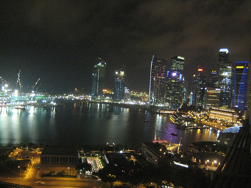 Well I've just arrived in Singapore, the view below is the view from my hotel room across the Singapore Marina. Flying in, down from the tip of Malaysia and across Singapore, you certainly get a feeling for where all the world's industry, shipping and so on are now located; looking out from my hotel room, there must be hundreds of ships either docked or waiting to load or unload; compared to London where you hardly see any shipping activity at all now, it's an eye opener to see the level of activity over here.