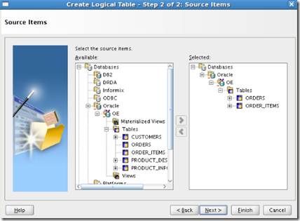 The first step is to create the business model and the corresponding logical tables that we need in the business model. In the OE schema we require 3 dimensions(Dim Order, Dim Product and Dim Customer) and a fact table containing 2 measures(Order Quantity and Order Volume). So, lets create the skeletal structure first for these 5 tables. Every logical table creation requires a corresponding source table to be provided. For example, if you require a logical table source containing the inner join of Orders and Order_items table, include both of them while creating the logical table(only related tables in the physical source can be chosen). OWB automatically recognizes the relationship between the tables and then creates an inner join. But unfortunately we cannot specify outer joins here (if the joins in the physical source are driven through constraints) which is possible through the BI EE Admin