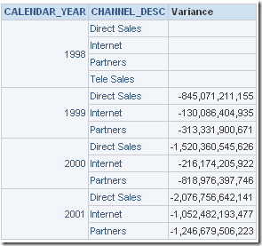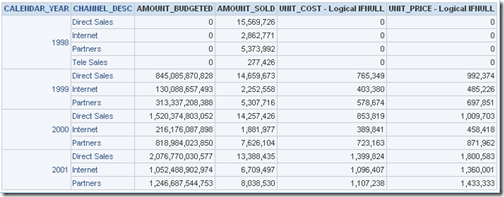Now, for the sake of illustration, lets assume that the FACT table SALES has data way back from 1998 for the AMOUNT_SOLD measure. But the Budgeting process only started in 1999. So, for all the records in the SALES fact table the AMOUNT_BUDGETED would be null for the year 1998 as shown below.