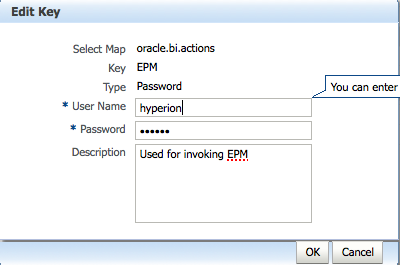 Within this Credential Map, create a new key called EPM. In the username and password section of the EPM key, enter the admin username and password that will be used to connect to the EPM catalog(in my case hyperion/welcome123). This username and password will be used only for the catalog navigation.