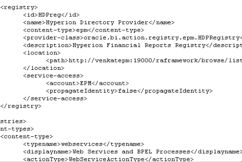 <registry> <id>HDPreg</id> <name>Hyperion Directory Provider</name> <content-type>epm</content-type> <provider-class>oracle.bi.action.registry.epm.HDPRegistry</provider-class> <description>Hyperion Financial Reports Registry</description> <location> <path>http://venkatepm:19000/raframework/browse/listxml</path> </location> <service-access> <account>EPM</account> <propagateIdentity>false</propagateIdentity> </service-access> </registry>