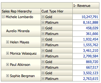 In this case, Sales Rep Hierarchy is a Parent-Child Hierarchy. The intention is to enable drilling on the measure column and then pass the Sales Rep name from this report to the target report (shown below)
