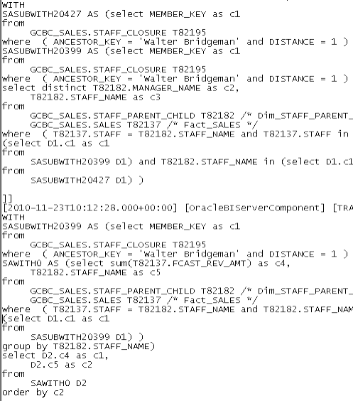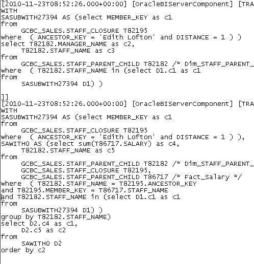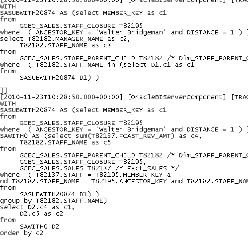 If we look at the underlying query, we can notice 2 separate queries for each level that we are drilling on. One is for extracting the next level members (using the closure table similar to Case 1 query). And the other one is for doing the roll-ups.