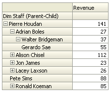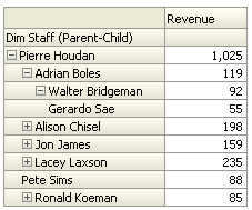 If we now create a report containing the Staff Hierarchy and Revenue, we will see the numbers being rolled up from the bottom of the hierarchy.