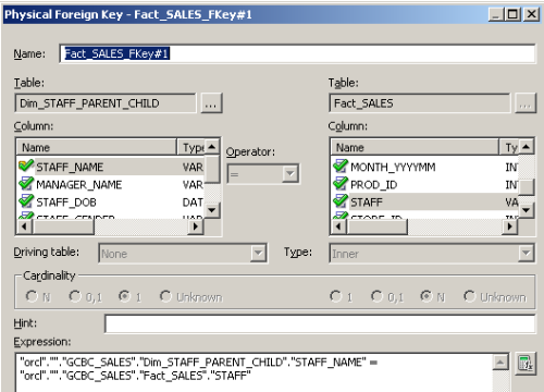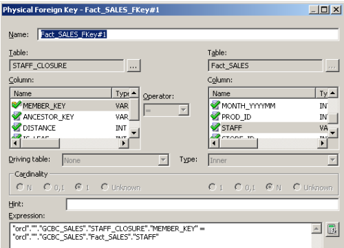To model this, we start with defining the joins. The only join we will need for this is an equi join between the Staff Parent-Child table and the SALES fact table. There need not be any join between the Closure table and the other tables.