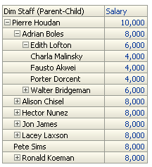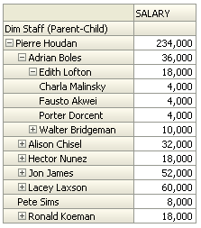 If we now create a report containing, the Staff Hierarchy and Salary, we can notice that the salaries get rolled up. Also, the individual's salary gets added to the Rolled-up salary (For ex. Edith Lofton's Salary = Sum of Salaries of Descendants + Salary of Edith Lofton).
