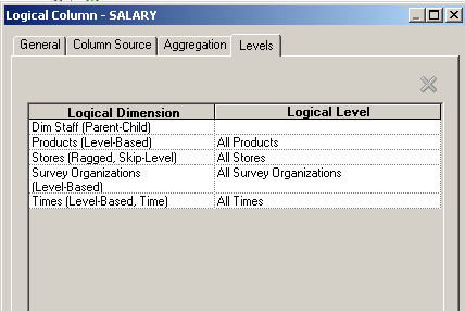 Then create a new fact logical table and include the Salary column from the Parent-Child Fact alias table. Assign the aggregation as SUM and also create complex joins to the necessary dimension tables. Since Salary is related only to the Staff dimension, we need to assign the measure to TOTAL level of all the other dimensions (to enable reporting across other dimensions as well).