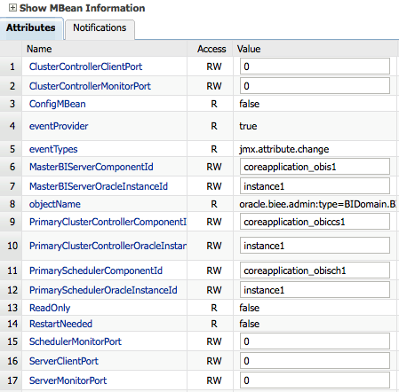 Each bean has 2 parts. One is an Attribute and the other is an Implementing Method. Attributes are like variables that can be updated using static values like Port Numbers, Number of BI Servers etc (InstanceConfig.xml settings etc). For example, AvailabilityConfigurationMBean shown below has multiple updatable attributes which can be seen from the MBean Browser.