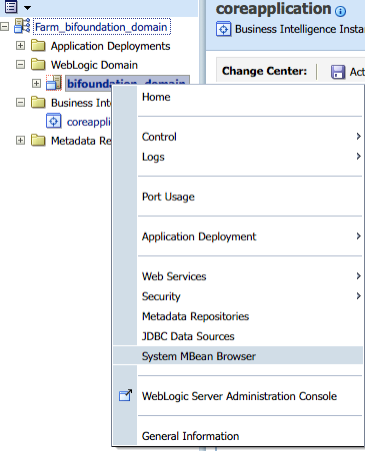 In the same way, we can use these JMX methods to do vertical clustering, Email updates, Log Configuration, SSO configuration etc. But once you start using these APIs, you will start noticing that almost every aspect of weblogic can be updated/queried using JMX. So, how do we actually get the other methods/attributes. This is where the System MBean Browser will be extremely helpful. MBean browser basically shows almost all the JMX endpoints that are exposed for integration. This can be invoked from the Enterprise Manager as shown below (right click on the bifoundation_domain under the WebLogic Domain in Enterprise Manager)