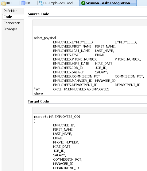 The sample code used for actual execution of the interface is shown below. As you see, the knowledge modules automatically push SELECT_PHYSICAL sql queries in order to bypass the BI EE subject areas.