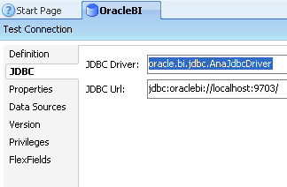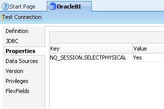 Test the connectivity. It should be successful. Since we are using the JDBC driver, we need to explicitly define the SELECTPHYSICAL property in order to make the driver to load the metadata from the Physical layer. To enable this, go to the Properties tab and then add Key-Value pair of NQ_SESSION.SELECTPHYSICAL=Yes as shown below