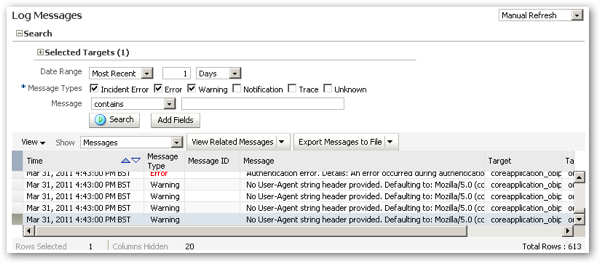 Oracle's Mike Durran is planning on giving a presentation at our BI Forum in May on accessing the DMS data via MBeans and persisting it in a relational database, but the area I'll be covering at this event is logging and use of the Log File Viewer in Enterprise Manager.