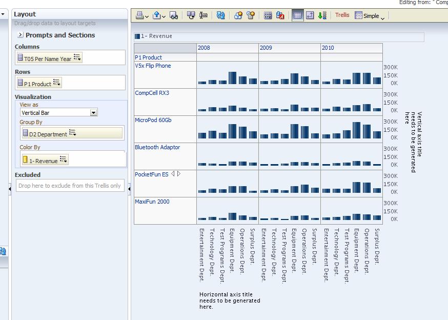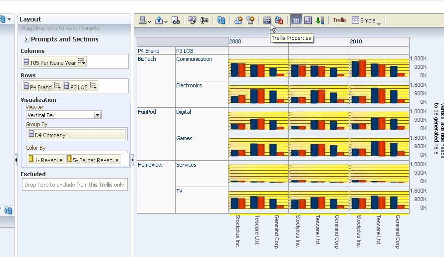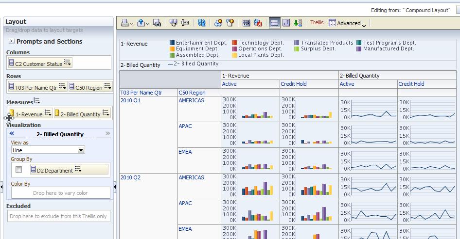 Now where I think Oracle are coming from here is the Edward Tufte-inspired sparkline idea, where a single visualization contains small, succinct micro-charts of information, to show stock movements over a time period, for example. I'm not sure what Exalytics is doing, in taking a regular chart and just miniaturising it, then placing it in a trellis of other charts, is quite what sparklines are all about, but it's a good start and could be useful for certain types of analysis.