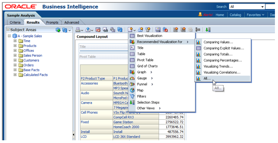 You can fine-tune this further by selecting a particular type of analysis you are looking to create (compare two numbers, for example), or just let Answers look at your data, the cardinality and so on, and suggest the best visualization for that. Sounds interested, but of course we'll need to see how well it works in practice (i.e., is it Watson, or Clippy?)