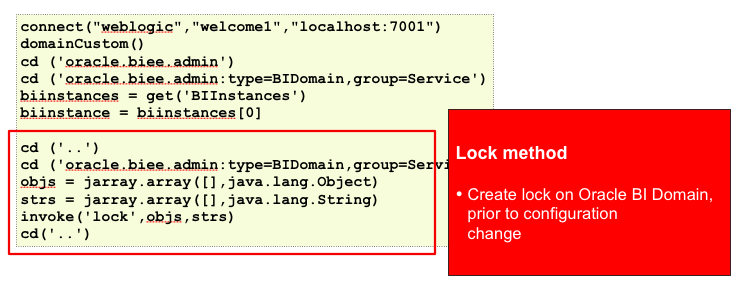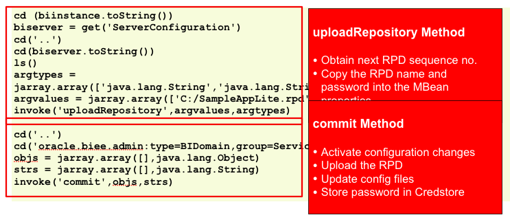 The main idea for this presentation came from a blog post I wrote a few months ago, entitled "So How Does Enterprise Manager work, Within OBIEE 11g?". In that blog post, I wrote about how Enterprise Manager, under the covers, uses the Java JMX MBeans to perform systems management tasks such as adding new system components to the cluster, uploading new repositories, or changing caching settings to enable, or disable it. Within the session, therefore, I talked about how Enterprise Manager is used primarily to manage the various components within an Oracle BI Domain, and how you could write scripts, like the one below, to manage the repository upload process and commit the changes to the domain.