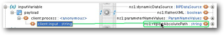 We finish off the variable configuration by setting the report that is to be run to the value that's passed in to the BPEL process. In our example, it will just be when we manually invoke it, but it could easily be part of a more complex SOA flow in which different reports are created at different stages as required. In the left pane of the Assign window, expand 'inputVariable' (this is what gets passed in to our BPEL process) until you see 'client:input : string'. Drag and drop this on to the ns1:reportAbsolutePath element on the right of the window.