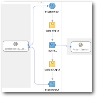 All that remains to complete the BPEL process now is to do something with the return from the Web Service. Add a second Assign step, just after the Invoke step. Edit this second Assign step to copy ns1:reportFileID from the output of the web service (called something like Invoke1_runreport_OutputVariable) to client:result : string of the BPEL process output (called outputVariable).