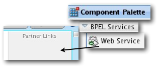 From the Component Palette on the right, find BPEL Services, and from here drag a Web Service item to the grey area on the right of the canvas that is titled Partner Links.