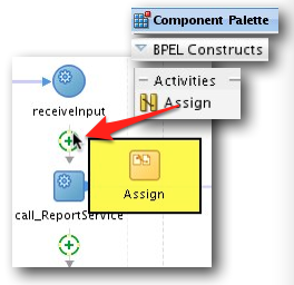 So, we've got a Web Service defined ("Partner Link"), and a call to it ("Invoke"). Now we need to set up the input variable, which defines the message contents that gets passed to the Web Service. To do this, we use an Assign step. Drag this from the Component Palette to the main canvas just before the Invoke step.