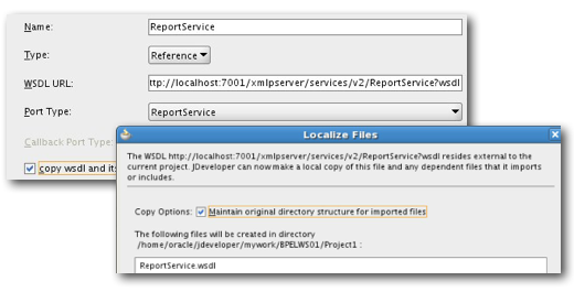 http://localhost:7001/xmlpserver/services/v2/ReportService?wsdland enter a Name, eg ReportService (this doesn't have to match the Web Service name). Tick the box to copy the WSDL into the project. When prompted to Localize Files, click OK