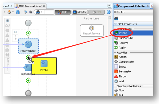 We've defined the Web Service (known in the BPEL process as a Partner Link), and now want to use it in the BPEL process. To do this, use an Invoke step. You'll find this in the Component Palette, under BPEL Constructs. Drag and drop it over the main canvas diagram, where you'll see plus icons appear between the steps. Place it between 'receiveInput' and 'replyOutput'