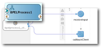 This takes us to the SOA Composite editor, showing the BPEL process component. We're interested in defining what the BPEL process will actually do, so double click on it to open it. This will open a .bpel tab in JDeveloper, showing the process graphically.