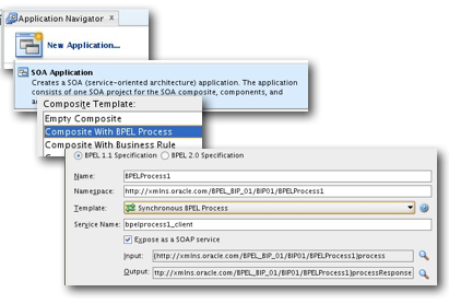 First, create a New Application in JDeveloper, picking the SOA Application template, and then when prompted for a Composite Template, choose Composite with BPEL Process. Once the application is created, you'll be prompted to create the BPEL process. Set the Template to Synchronous BPEL Process, and click OK.