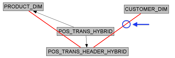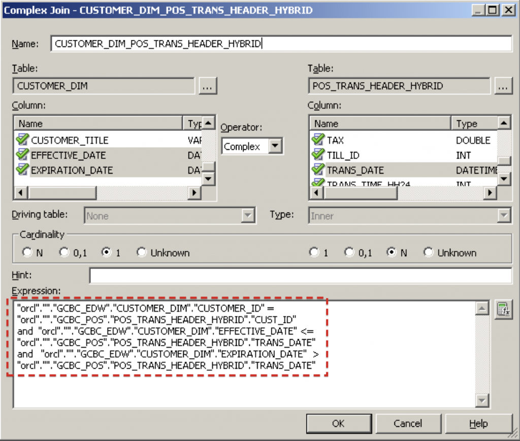 We start by creating aliases to our transactional "fact" tables (called POS_TRANS_HYBRID and POS_TRANS_HEADER_HYBRID in the example above), because we don't want to upset the logical table source (LTS) that we are already using for the pure transactional version of the logical fact table. We create a complex join between the customer source system natural key and transaction date in our hybrid alias, and the natural key and effective dates in the dimension table. We use the effective dates as well to make sure we grab the correct version of the customer entity in question in situations where we have enabled Type 2 SCD's (the usual standard) in our dimension table.