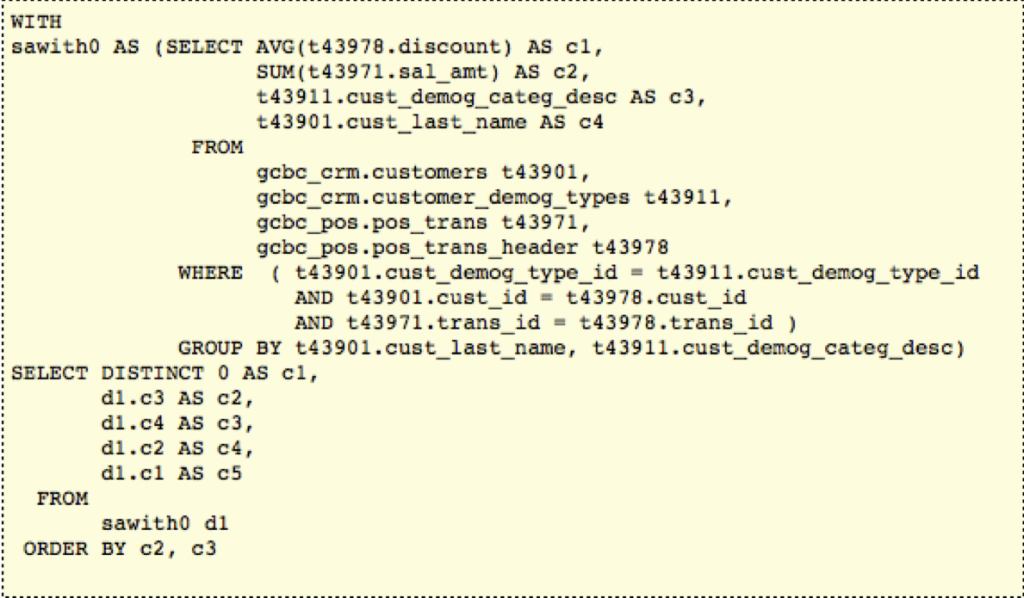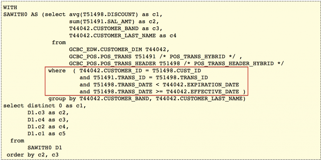When embarking on ETL development, it's common to do SQL prototyping before starting the actual mappings to make sure we understand the particulars of granularity. However, we already have these SQL prototypes in the nqquery.log file... all we have to do is look at it. The combination of the source-to-target-mapping and the SQL prototypes provide all the artifacts necessary to get started with the ETL.