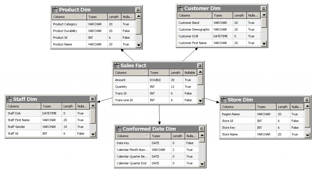 The answer, of course, is that we can. We'll develop the model and ETL exactly as we would if our goal was to plug the dimensions into a complete subject area. We use surrogate keys as the primary key for each dimension table, facilitating joining our dimension tables to completed fact tables. But we don't have completed fact tables at this point in our project... instead we have a series of transaction tables that work together to form the basis of a logical fact table. How can we use a dimension table with a surrogate key to join to our transactional "fact" table that doesn't yet have these surrogate keys?