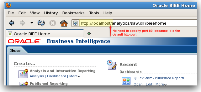 By default, OBI 11g will listen for connections on port 7001 or port 9704 depending on your installation type. There are several reasons you may want to change this, and one of them would be to make it use port 80, the default http port. If you use port 80, then you don't have to specify it in the URL, so you can use http://biserver/analytics/ as your URL instead of http://biserver:9704/analytics/.The port configuration is a simple change to be made to the Server configuration in Web Logic Console. However, if you want to use port 80 and are running Linux/Unix there is an additional consideration. On Linux/Unix (hereafter, I'll just refer to Linux), any port < 1024 is considered privileged and you must run the program binding to it as root.