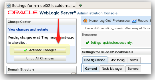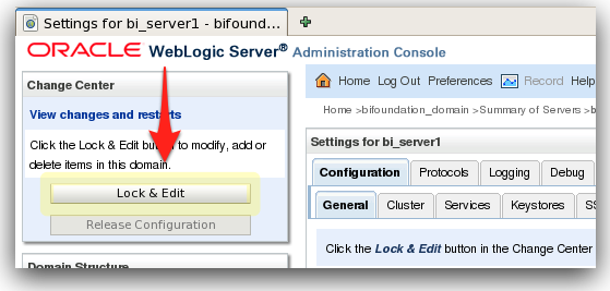 Depending on whether you have a Enterprise or Simple OBI installation, the configuration will differ slightly. See Mark's post here for explanation of the difference between the two installation types. In an Enterprise installation, you need to modify the properties of the bi_server1 Managed Server, whereas a Simple installation has all the bits within AdminServer.For both however, you need to login to Web Logic Admin Console, and locate the Servers screen. Click on either AdminServer (Simple installation) or bi_server1 (Enterprise installation) to view the Server settings.