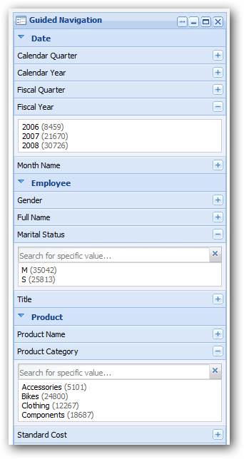 Finally, once you're done, the application would look something like this, with navigation down the side, visualizations on the rest of the page, and multiple pages of information. As you click on the guided navigation items, the controls on the right are automatically filtered, in a similar way to Qlikview, or the new high-speed visualizations provided with Exalytics.