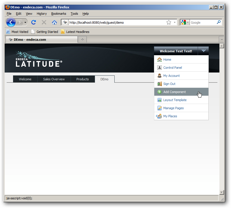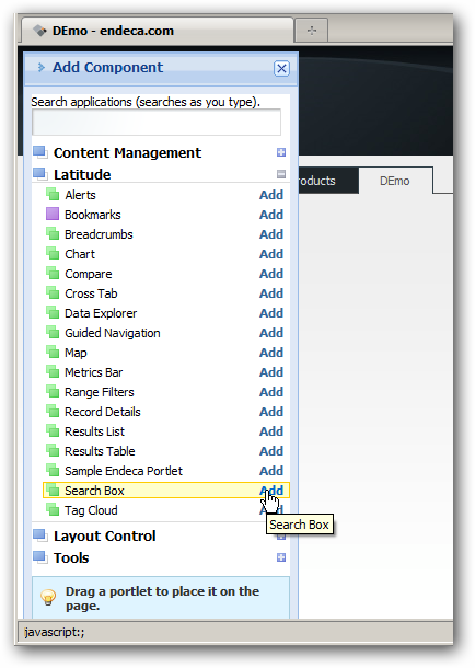 Endeca Studio is a web-based environment that presents you initially with a blank canvas, to which you can add pages and Studio components. These components communicate with MDEX via web services, and you add them from the Control Panel > Add Component in Studio, like this:
