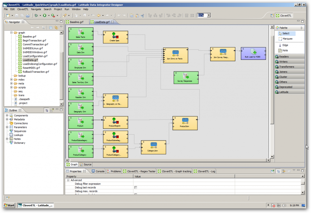 So the first task that you'll need to perform is obtain your data, and then use Endeca Latitude Data Integrator to ETL it into an MDEX engine. If you've used tools such as ODI or OWB, you'll be familiar with the concept of a graphical ETL tool, and Latitude uses an OEM'd version of the open-source CloverETL tool for this task. Using Data Integrator, you either import or create references to your source data, define metadata for it such as the column structure, then create mappings, or "edges" between the source data and either transformation operators, or operators that load data into the MDEX engine. In the screenshot below, you can see a typical "graph" loading data from some source files into an MDEX engine, using the bulk-load writer transformation.