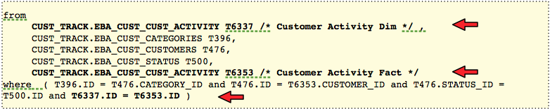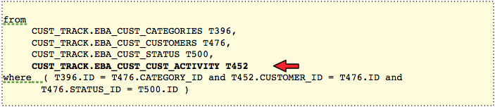 Using the 2 alias approach, we would get a self join to the EBA_CUST_ACTIVITY table: once as a dimension and once as a fact: