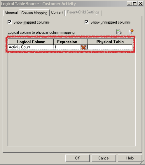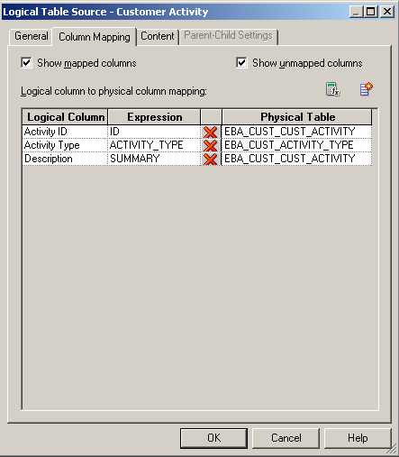 Once we have decided to place the Description attribute in the logical dimension table called Dim - Customer Activity, instead of placing it in Fact - Customer Activity, we now have a decision to make about how to construct the logical table source. The common approach I see is to construct two aliases of the source table, in this example, EBA_CUST_ACTIVITY: one to use as the dimension component of the table, and the other to use as the fact component. Even though I often see this approach, I still haven’t figured out why it is common. The preferred approach is to use the same physical source, either a single alias or a single physical table, as the source for both the dimension logical table source, and the fact logical table source.