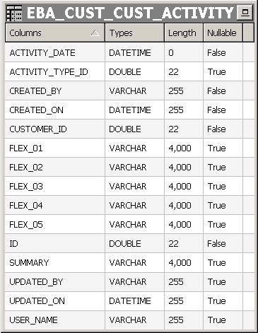 The first approach I want to demonstrate is not as easy as the Sales Order example; it involves a more operational reporting requirement, and how to arrange our logical fact table when we really have no measures at all. In this scenario, what we have is a sort of relationship table, where we require a fact table, but the purpose of that fact table is only to form a bridge between various dimensional tables. Ralph Kimball calls this form of relationship table a factless fact table. As Kimball explains, the event is the fact, and he uses the example of the student attendance fact, where the only thing that is being recorded in the fact is the presence of a particular student, in a particular class, with a particular professor, on a particular day, etc. For the Customer Tracking application, we want to report on customer activities stored in the EBA_CUST_CUST_ACTIVITY table:
